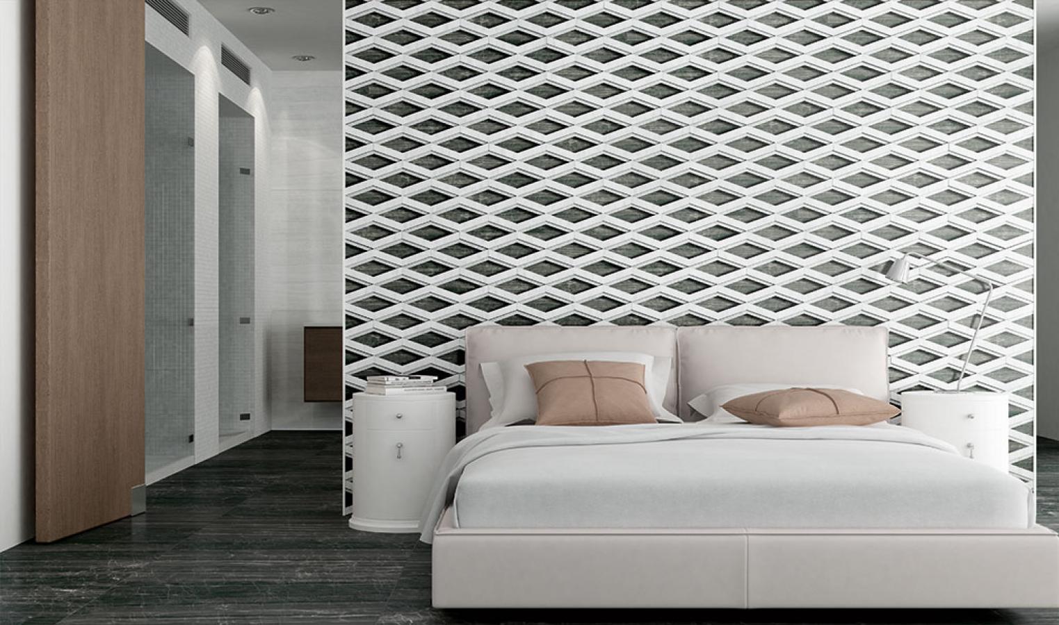 Nanoessence nowa kolekcja zaprezentowana na targach Cersaie z wieloma ciekawymi dekoracjami, które dzięki zastosowaniu różnych kolorów i rodzajów płytek dają na ścianie efekt 3D.
